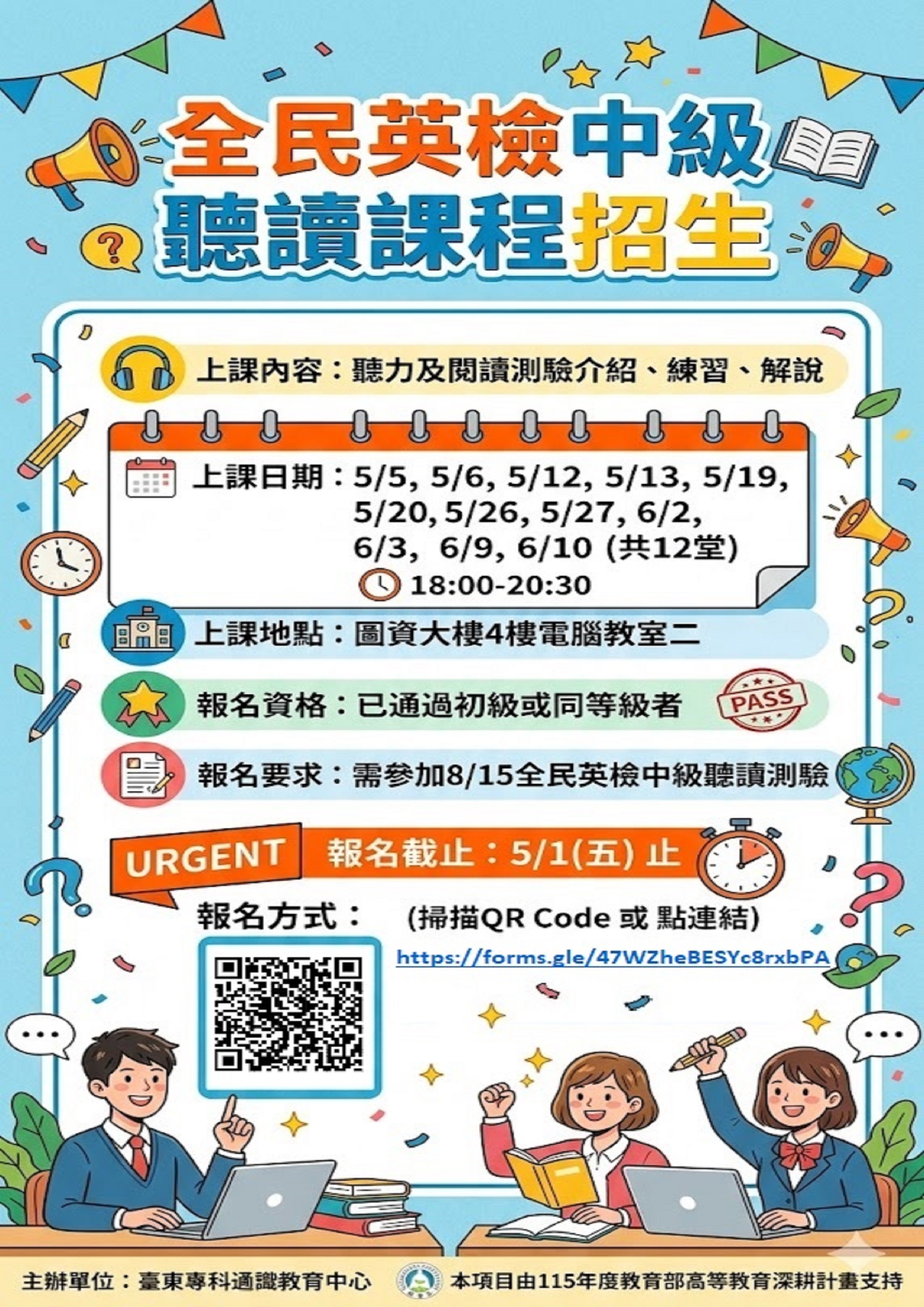 報名要求: 需參加8/15全民英檢中級聽讀測驗